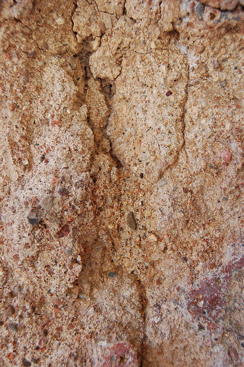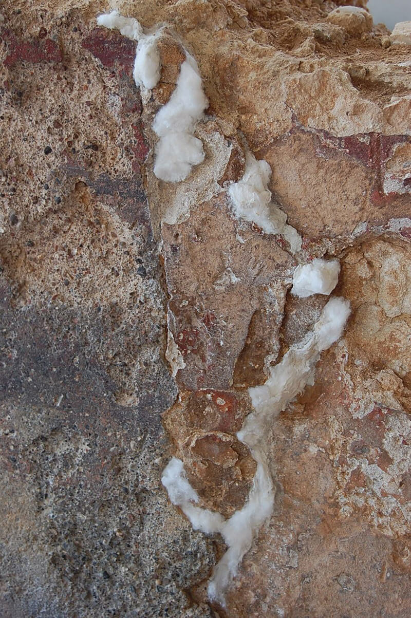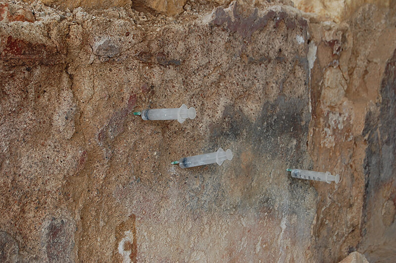 La intervención se centró en la estabilización de los revestimientos murales y en la consolidación de los morteros originales, respetando las huellas del tiempo y las fases constructivas visibles en los paramentos.